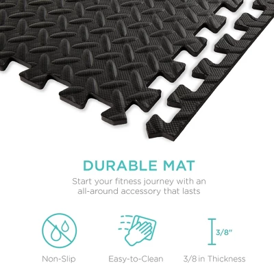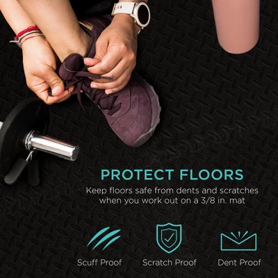 Keep your floors safe from dents and scratches when you work out on a 3/8-inch mat and start your fitness journey with an all-around accessory that lasts. Made with non-toxic EVA foam for a sturdy surface that is safe to use, moisture resistant, and shock absorbent. Lightweight tiles interlock neatly and quickly for a customizable setup, while removable edges allow for a clean look in any room including the garage, home gym, play room, and pet area.