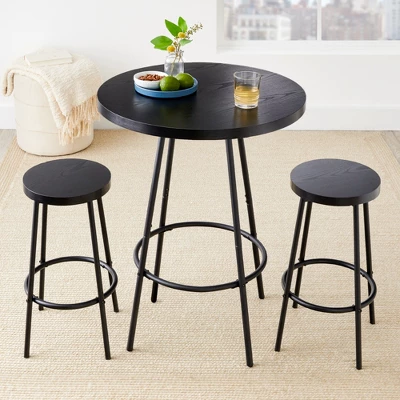 - COUNTER-HEIGHT SET FOR 2: An elevated table and chairs with open metal supports create a distinctly minimalist design that’s perfect for any dining space