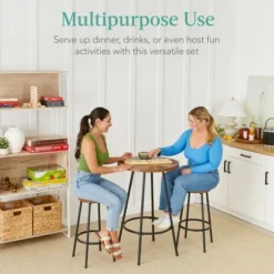 This Counter-Height Set for 2, is a minimalist masterpiece that brings elevated style to any dining space. With its open metal supports and sleek design, this set exudes a distinctly modern appeal. Whether you’re enjoying a light meal, sipping drinks, pursuing your hobbies, or engaging in a thrilling game night, this multipurpose set is the perfect venue for two. Designed with space-saving in mind, the compact table and chairs fit seamlessly into apartments, small nooks, or complement existing setups. You can relax comfortably knowing that the table can accommodate 220 pounds, while the seats can hold up to 275 pounds, thanks to the built-in footrests and supports. Elevate your dining experience with our Counter-Height Set for 2, combining style, functionality, and durability in one elegant package.