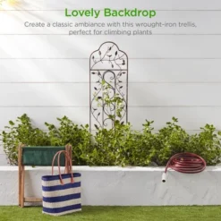 Create a classic ambiance with this wrought-iron trellis, perfect for climbing plants. Built with intricate details fit for a garden or cozy patio, its elegant design includes charming bird silhouettes for eye-catching appeal. A durable, welded iron build is made to last for years to come, with .75″ thick bars and a weather-resistant finish. This trellis is the perfect addition to showcase beautiful climbers and vines such as Bougainvillea or Honeysuckle, as it creates a beautiful garden aesthetic when plants grow through the loops and turns. A versatile design makes for climbing plants adding a lovely backdrop to any part of your home, fences, lawn, or garden. For placement purposes, this trellis measures at 15.5 in. x 59.25 in. or 39.4 cm x 150.5 cm.