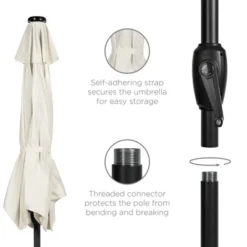 Enjoy more shade at the perfect angle as you adjust the canopy to block the sun all day long. Use it for any occasion; turn your outdoor dining area into a shaded lounge for family and friends. Solar-powered LED allows you to reignite your passion for outdoor dining and brighten your summer nights. UV protection is provided through a fabric shade that is UPF50 certified to diffuse sunlight. A built-in, pulley-assisted crank opens and closes the umbrella. The durable, rust-resistant steel pole prevents wear over time. A push-button tilt means you can freely adjust the angle with a locking tilt joint. The self-adhering strap secures the umbrella for easy storage. Help ensure a durable assembly, as the threaded connector protects the pole from bending and breaking. Make no mistake, this is the umbrella for years of enjoyment!